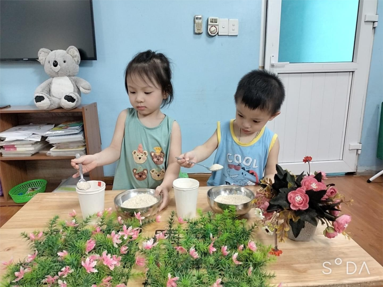 Kỹ năng xúc hạt gạo bằng thìa: Rèn luyện sự tập trung và khéo léo đôi bàn tay của các bạn nhỏ bằng hoạt động xúc hạt gạo bằng thìa, kĩ năng nâng cao hơn một chút với thử thách hạt gạo được đưa từ chiếc bát sang cốc bằng chiếc thìa nhỏ lại càng làm cho các bạn nhỏ rèn được sự khéo léo của đôi tay.